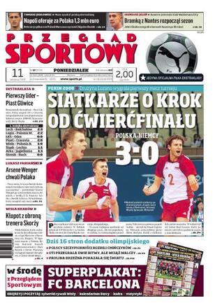 Nasi siatkarze zwyciężyli Niemców w pierwszym meczu turnieju olimpijskiego; Otylia Jędrzejczak odpadła w eliminacjach - została jej już tylko jedna szansa; polscy szczypiorniści pokonali gospodarzy igrzysk; znakomity start Pauliny Brzeźnej; Piast Gliwice pierwszym liderem ekstraklasy w tym sezonie; kontuzje obrońców Wisły przed meczem z Barceloną; świetny występ Ireneusza Jelenia w meczu Auxerre-FC Nantes.