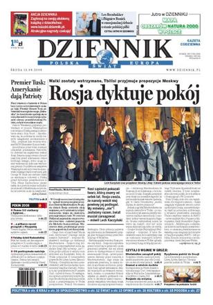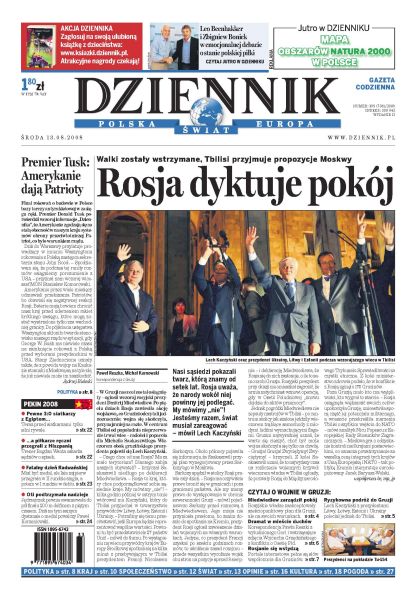 Walki w Gruzji wstrzymane, Tbilisi przyjęło propozycje Moskwy; Lech Kaczyński z prezydentami Łotwy, Litwy, Estonii i Ukrainy poleciał do stolicy Gruzji; Rosjanie wstydzą się za swoje władze; Amerykanie zgadzają się na obecność w Polsce systemów obrony przeciwlotniczej Patriot; wojna na Kaukazie stała się testem dla kandydatów na prezydenta USA; minister skarbu zlecił kontrolę w TVP; Julia Pitera chce jawności majątków nie tylko parlamentarzystów; Polacy z Wysp Brytyjskich chcą wracać i inwestować we własne firmy; młodzież nie ma wiedzy o życiu seksualnym, dojrzewaniu i biologii; reportaż o chińskich wolontariuszach w Pekinie; polscy siatkarze pokonali Egipt; Radwańska odpadła w II rundzie turnieju; Otylia Jędrzejczak awansowała do półfinału. Dodatki: The Wall Street Journal Polska, Warszawa.
