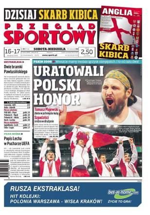Tomasz Majewski złotym medalistą olimpijskim w pchnięciu kulą; polscy szpadziści wywalczyli drużynowe srebro; wywiad z Tomaszem Motyką; Paweł Słonimski mówi o przyczynach niepowodzeń i dalszej pracy z Otylią Jędrzejczak, ona sama myśli o przerwie w karierze; nawet wygrana z USA może nie zapewnić naszym siatkarkom awansu do ćwierćfinału; Sebastian Świderski wierzy w możliwości drużyny; polscy szczypiorniści zagrają w ćwierćfinale; nasi wioślarze zawalczą w niedzielę o olimpijskie podium; Pawlusiński zdobył dwie bramki dla Cracovii w meczu z ŁKS Łodzią; w meczu Pucharu UEFA Lech Poznań pokonał Grasshopper Zurych 6:0.