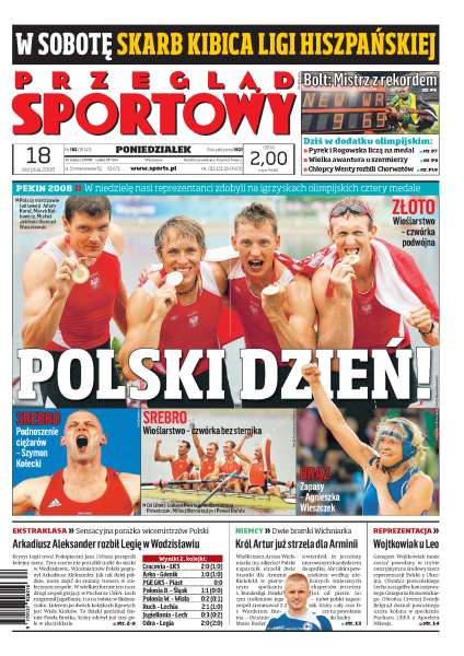 Złoto wioślarskiej czwórki podwójnej, srebro Szymona Kołeckiego w ciężarach, srebro wioślarskiej czwórki bez sternika, brąz Agnieszki Wieszczek w zapasach - świetny dzień Polaków w Pekinie. Niesamowita setka i 9,69 Usaina Bolta! Dziś m.in. skok o tyczce pań i dwa skoki Leszka Blanika. Legia przegrała w Wodzisławiu, Paweł Brożek już prowadzi w klasyfikacji strzelców, Artur Wichniarek strzelił Werderowi dwie bramki.