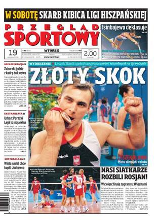 Leszek Blanik wskoczył na najwyższy stopień podium, reprezentacja siatkarzy pokonała Rosję i zagra z Włochami, rekord świata Jeleny Isinbajewej - Polki bez medalu, Marcin Dołęga o 7 dekagramów za ciężki na medal. Ponadto: Mariusz Lewandowski opowiada o Ukraińcach przed zbliżającym się meczem obu reprezentacji, kłopoty Jana Urbana, budżety piłkarskich klubów 1 ligi, dzika karta dla Wiesława Jagusia.