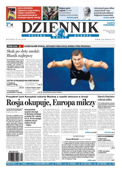 Lech Kaczyński oskarża Moskwę o czystki etniczne w Gruzji, bateria Patriotów ma obronić Warszawę przed atakiem z północy lub wschodu, Waldemar Pawlak już chce funduszu dla ofiar klęsk żywiołowych, polskim internetowym stronom rządowym grozi atak, przez błąd NFZ dziecięcym klinikom onkologicznym grozi bankructwo, prezydent Pakistanu Perwez Muszarraf podał się do dymisji, złoty medal Leszka Blanika i zwycięstwo siatkarzy z Rosją. Dodatki: The Wall Street Journal Polska, Warszawa, Nieruchomości.