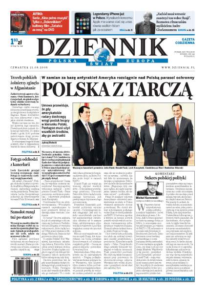 Umowa o zainstalowaniu tarczy rakietowej została podpisana, komentarze do umowy, jak działa tarcza i wyrzutnie Patriot, Anna Fotyga odchodzi z kancelarii prezydenta, wielka awaria prądu w Warszawie, 140 ofiar katastrofy lotniczej w Madrycie, drogie moskiewskie hotele: średnio 540 dolarów za noc. Sport: fantastyczny bieg Usaina Bolta na 200 m, Polacy słabo, porażka piłkarzy z Ukrainą.