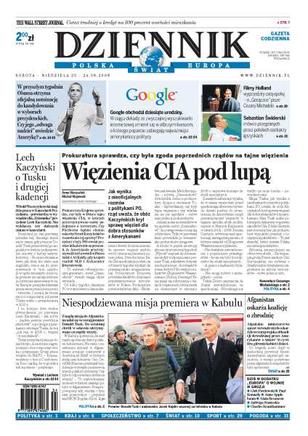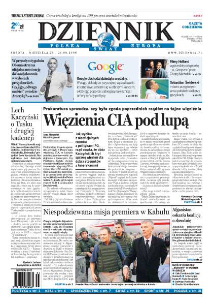 Rozmowa z Lechem Kaczyńskim o gruzińskiej wyprawie, planach walki o reelekcję i konfliktach z rządem Donalda Tuska, Prokuratora Krajowa sprawdzi, czy w Polsce były tajne więzienia CIA, politycy od ojca Tadeusza Rydzyka straszą władze PiS, rosyjski parlament przymierza się do uznania niepodległości Abchazji i Osetii Południowej, Amerykanie oskarżeni o śmierć 76 cywilów w Afganistanie, 10 lat Google'a. Dodatki: The Wall Street Journal Polska, Europa (różne spojrzenia na wojnę w Gruzji), Warszawa, Podróże.