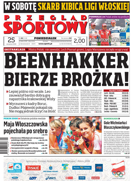 Piłkarze wyrzuceni z kadry przepraszają Leo Beenhakkera; Paweł Brożek powołany na mecze ze Słowenią i San Marino; sylwetka Bartosza Bosackiego; podsumowanie igrzysk w Pekinie; wywiad z Usainem Boltem; Robert Kubica trzeci w Walencji.