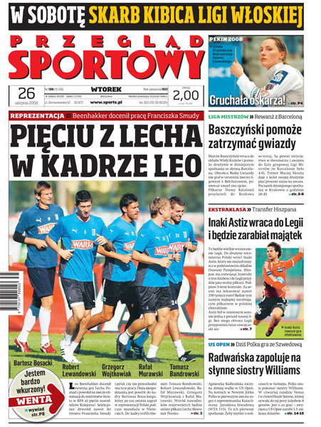Leo Beenhakker docenił pracę Franciszka Smudy; Sylwia Gruchała oskarża związek i prezesa PZS; opinie i relacje przed meczem Wisła-Barcelona; polscy sportowcy na olimpiadzie: podsumowania, rankingi, analizy; raport z transferów Ekstraklasy; Artur Wichniarek zdobył już trzy bramki w Bundeslidze; wywiad z Agnieszką Radwańską z US Open.