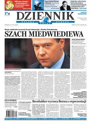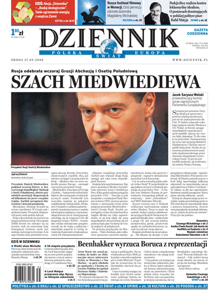 Rosja odebrała Gruzji Abchazję i Osetię Południową; Zachód musi poprzeć Gruzję mimo błędu i przegranej Micheila Saakaszwilego; Janusz Kurtyka o braku Wałęsy w katalogu IPN; rozpoczyna się Międzynarodowy Festiwal Filmowy w Wenecji; mistrzowie Polski w dobrym stylu pokonali Barcelonę; w hotelu we Lwowie rozrabiali nie tylko Boruc, Dudka i Majewski, ale tylko oni zostali ukarani.