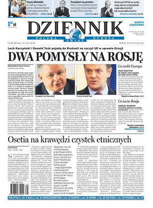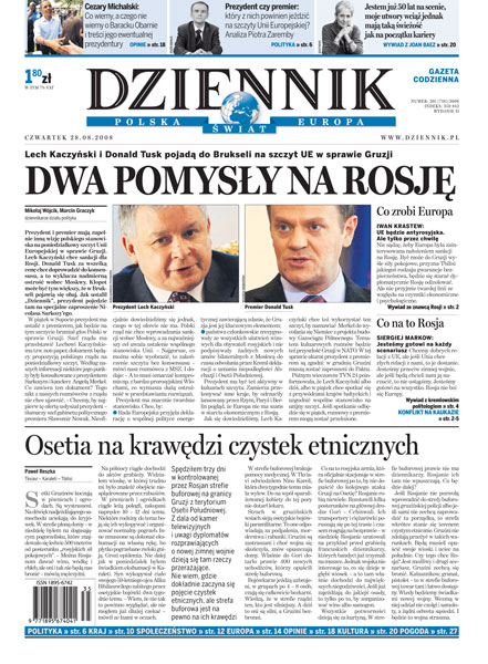 Lech Kaczyński i Donald Tusk pojadą do Brukseli na szczyt UE w sprawie Gruzji; Osetii grożą czystki etniczne i wojna domowa; konflikt na Kaukazie: dlaczego Rosja chce konfrontacji, jak Zachód może ukarać Kreml; co wiemy,a czego nie wiemy o Baracku Obamie i treści jego ewentualnej prezydentury; brytyjska firma, wykorzystując lukę w prawie, otworzy sklep z „dopalaczami”; rolnicy mają ustawowy obowiązek ubezpieczania budynków gospodarczych, ale blisko jedna piąta nie wykupuje polis OC; Zbigniew Ziobro czuje się represjonowany.