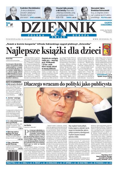 Seria książek Alfreda Szklarskiego wygrała plebiscyt Dziennika na najlepszą książkę dla dzieci; Jan Rokita wraca do polityki jako publicysta; dziś szczyt w Brukseli - czy UE nałoży sankcje na Moskwę; nad Nowy Orlean nadciąga huragan „Gustav”; polscy politycy nie chcą filozofii w szkołach; wywiad z Kazimierzem Marcinkiewiczem; Marina Litwinienko nie chce zemsty, tylko prawdy; Komorowski liczy, że Ziobro sam zrzeknie się immunitetu poselskiego; będziemy płacili za torebki foliowe.