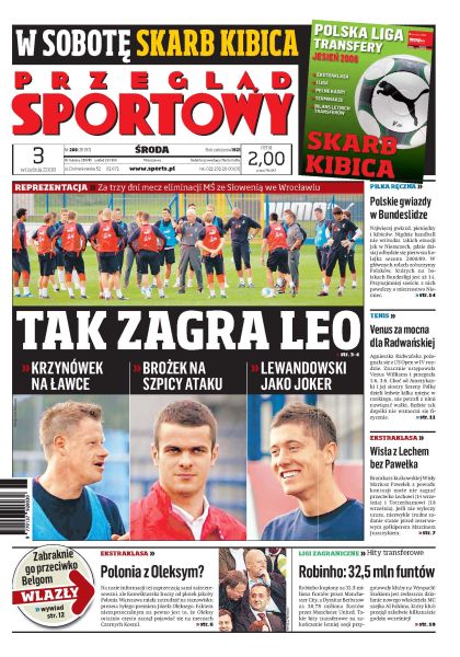 Przed meczem ze Słowenią Beenhakker został tylko z dwoma napastnikami; Mariusz Pawełek nie zagra w meczu Wisły przeciwko Lechowi i Tottenhamowi; rozmowa z Robertem Lewandowskim; władze Polonii Warszawa rozważają możliwość zatrudnienia Józefa Oleksego; dziś w Niemczech rusza pierwsza kolejka Bundesligi w piłce ręcznej; jeszcze w tym roku ruszy proces w sprawie korupcji w Koronie Kielce; kluby na Wyspach są mistrzami w najdroższych i zaskakujących transferach; Venus Williams okazała się za mocna dla Radwańskiej, Isia pożegnała się z US Open; wywiad z Mariuszem Wlazłym.