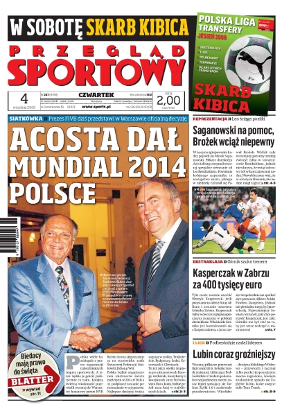 Mistrzostwa świata w siatkówce w 2014 odbędą się w Polsce; Beenhakker powołał Saganowskiego do kadry; czy Henryk Kasperczak będzie trenował Górnika Zabrze; wywiad z Bartoszem Bosackim; ponad 700 osób trafiło do aresztu w wyniku zamieszek przed meczami w Warszawie; Jarosław Fojut opowiada o nowym klubie Smolarka; Michał Winiarski od lat cierpi z powodu zwyrodnienia kręgosłupa, teraz czeka go operacja.