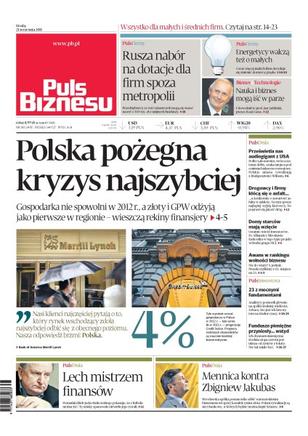 Polska pożegna kryzys najszybciej – gospodarka nie spowolni w 2012 roku, a złoty i GPW odżyją jako pierwsze w regionie wg rekinów finansjery; rusza nabór na dotacje dla firm spoza metropolii; energetycy walczą też o małych; nauka i biznes mogą iść w parze – udowodnił to profesor Jan Lubiński, prezes Read-Gene; prześwietla nas audiogigant z USA – Dolby Laboratories; drogowcy i firmy kłócą się o asfalt; awans w rankingu wolności biznesu; fundusze pieniężne przyniosły wstyd; mennica kontra Zbigniew Jakubas; Lech Poznań mistrzem finansów.