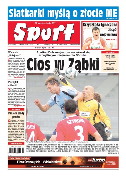 Stadion Dolcanu jeszcze raz okazał się szczęśliwym miejscem dla Górnika; Lech Poznań po raz trzeci z rzędu zwyciężył w rankingu Ekstraklasa Piłkarskiego Biznesu przygotowanym przez firmę doradczą Ernst & Young; dziś reprezentacja pań wylatuje do Serbii, gdzie rozpocznie rywalizację o medale ME w siatkówce; start biegającego na protezach z włókna węglowego reprezentanta RPA, Oscara Pistoriusa, na 400 m wzbudził największe