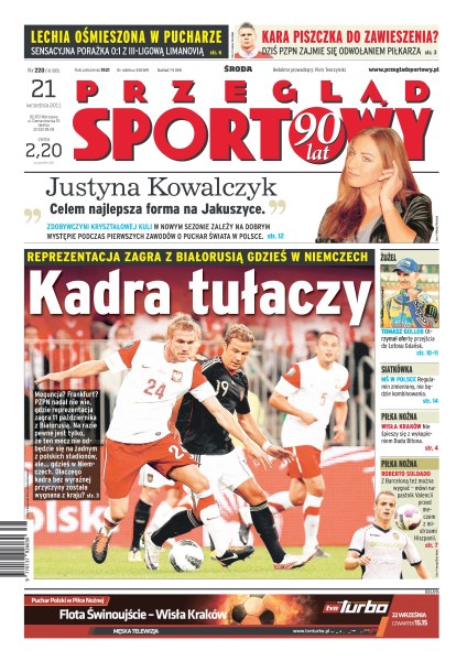 Reprezentacja Polski zagra z Białorusią gdzieś w Niemczech; Tomasz Gollob otrzymał ofertę przejścia do Lotosu Gdańsk; regulamin MŚ w siatkówce został zmieniony, nie będzie kombinowania; Wisła Kraków nie śpieszy się z wykupieniem Dudu Bitona; napastnik Valencii Roberto Soldado twierdzi, że z Barceloną też można wygrać; Justyna Kowalczyk chce jak najlepiej wypaść w Jakuszycach; Lechia ośmieszona w pucharze – sensacyjna porażka 0-1 z III-ligową Limanovią; PZPN zajmie się dziś odwołaniem Piszczka.