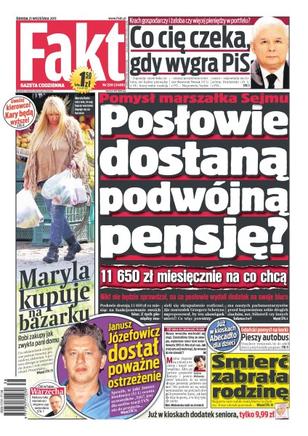 Posłowie dostaną podwójną pensję – pomysł marszałka Sejmu; gdański pomysł na korki – pieszy autobus; Janusz Józefowicz dostał poważne ostrzeżenie od szefów telewizji TVN; Maryla Rodowicz kupuje na bazarku; co cię czeka gdy wygra PiS: krach gospodarczy i żałoba czy więcej pieniędzy w portfelu.