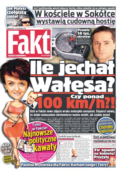 Jak szybko jechał Wałęsa; najnowsze polityczne kawały – tylko w Fakcie; w kościele w Sokółce wystawią cudowną hostię; jak Małysz został czołgistą; dziś prawdziwej maślanki już nie ma; tir spadł na kobietę - przeżyła; „Kocham tango i Tatry” – Paulina Młynarska specjalnie dla Faktu; Kora uczy się latać; Wodecki ocenia Józefowicza.