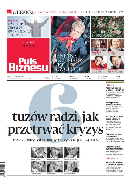 Sześciu tuzów radzi jak przetrwać kryzys – przedsiębiorcy dodają otuchy: Polacy sobie poradzą; kadrowe starcie w Wałbrzyskiej SSE; P4 – właściciel sieci Play – złożył ofertę na zakup częstotliwości; Platige Image – firma, którą współtworzy Tomasz Bagiński – przymierza się do debiutu na giełdzie; firmy sprzedaży bezpośredniej są lepsze od tych w internecie; węgierski wariant spłat kredytu nie rozpalił wyobraźni naszych polityków; PGE przymierza się do centralizacji zakupów – początkowo za 4-7 mld zł.