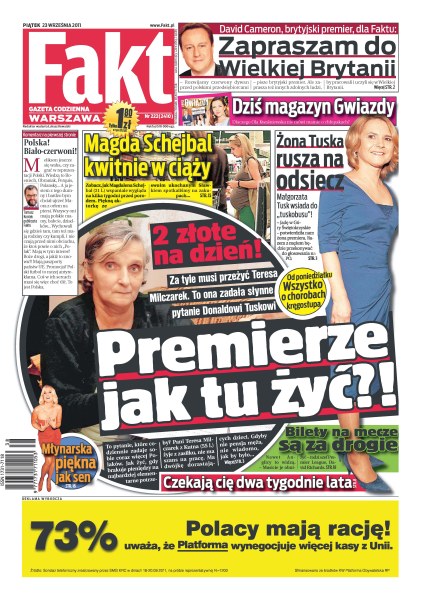 Premierze, jak tu żyć – Teresa Milczarek musi przeżyć za dwa złote na dzień; żona premiera rusza na odsiecz – Małgorzata Tusk wsiada do „tuskobusu”; Magda Schejbal kwitnie w ciąży; David Cameron zaprasza polskich przedsiębiorców do Wielkiej Brytanii; bilety na mecze są za drogie; Młynarska piękna jak sen.