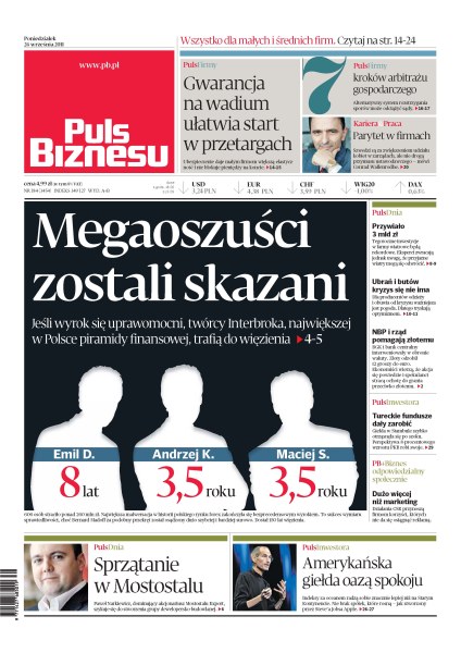 Twórcy Interbroka – największej w Polsce piramidy finansowej – trafią do więzienia, jeśli wyrok się uprawomocni; gwarancja na wadium ułatwia start w przetargach; siedem kroków arbitrażu gospodarczego; Szwedzi chcą zwiększyć udział kobiet w zarządach; będą rekordowe inwestycje w farmy wiatrowe; ubrań i butów kryzys się nie ima; NBP i rząd pomagają złotemu w walce ze spekulantami; giełda w Stambule szybko otrząsnęła się po szoku; Paweł Narkiewicz, dominujący akcjonariusz Mostostalu Export, szykuje się do stworzenia grupy dewelopersko-budowlanej; amerykańska giełda oazą spokoju.