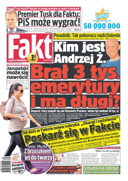 Kim jest Andrzej Ż. – brał 3 tysiące emerytury i ma długi; „Jaruzelski może się nawrócić” – biskup Tadeusz Pieronek; „PiS może wygrać” – premier Tusk udzielił Faktowi szczerego wywiadu w swoim tuskobusie; jak pokonać nadciśnienie; nowa rubryka w Fakcie – skargi i zażalenia – poskarż się w Fakcie; 17-latka zabiła własnego ojca; Franciszek Smuda nie zdobył Radosława Sobolewskiego; Anna Mucha – z brzuszkiem jej do twarzy.