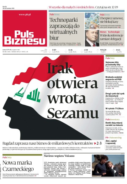 Irak otwiera wrota Sezamu – Bagdad zaprasza nasz biznes do miliardowych kontraktów; technoparki zapraszają do wirtualnych biur; ubezpiecz umowę – nie blokuj kasy; wideokonferencje zamiast delegacji; sejmowe kity przesłoniły hity – politycy zasłużyli na brawa za ustawy deregulacyjne, rózga należy im się za reformę OFE – oceniają przedsiębiorcy; Bruksela uzależni wsparcie od PKB; drogi cynk dał cynk do inwestycji – po trudnych latach polskie firmy złapały wiatr w żagle; w rytmie TV.Disco – na nowej fali disco polo chce zarabiać 4fun Media z pomocą biura TVN; banki dają więcej zarobić na lokacie; nowa marka Czarneckiego – Lion's House – pomoże najbogatszym klientom w kryzysowych czasach poruszać się w nieruchomościowym biznesie.