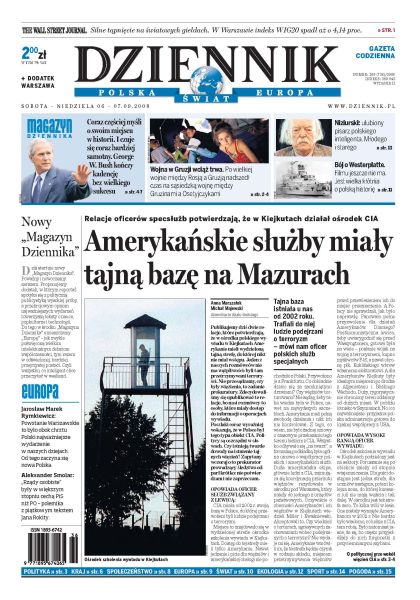 CIA miało tajną bazę w Kiejkutach na Mazurach; PSL chce podzielić miejsca w radach nadzorczych mediów publicznych między wszystkie kluby parlamentarne; za 2 miliardy złotych można zapewnić całej Polsce powszechny dostęp do internetu; wizyta Dicka Cheneya w Kijowie zniknęła w natłoku wewnętrznych sporów na Ukrainie; McCain robi wszystko by uniknąć skojarzeń z Bushem; żółw błotny znów pojawił się w Polsce; wywiad z Leo Beenhakkerem przed meczem ze Słowenią. Dodatki: The Wall Street Journal, Warszawa, Europa, Magazyn Dziennika.