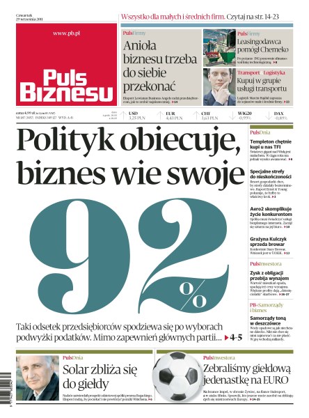 Polityk obiecuje, biznes wie swoje – ponad 90% przedsiębiorców spodziewa się po wyborach podwyżki podatków; Anioła biznesu trzeba do siebie przekonać; leasingodawca pomógł Chemeko – po pożarze ING ponownie sfinansował linię technologiczną; kupuj w grupie usługi transportu – logistyk Marcin Hajdul zaprasza do sojuszu małe i średnie firmy; Templeton chętnie kupi u nas TFI; specjalne strefy do nieskończoności – resort gospodarki chce, by strefy działały bezterminowo; Aero2 skomplikuje życie konkurentom – spółka musi świadczyć usługi bezpłatnego internetu; Grażyna Kulczyk sprzeda Stary Browar – wniosek jest w UOKiK; zysk z obligacji przebija wynajem; samorządy toną w deszczówce; Solar zbliża się do giełdy.