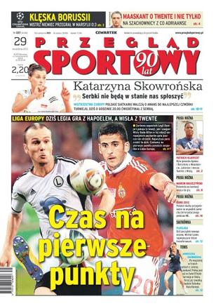 Dziś Legia gra z Hapoelem, a Wisła z Twente – czas na pierwsze punkty w Lidze Europy; klęska Borussii – mistrz Niemiec przegrał 0-3 z Marsylią; Maaskant o Twente i nie tylko; „Serbki nie są w stanie nas spłoszyć” – polskie siatkarki walczą o awans do najlepszej czwórki turnieju; Marcin Baszczyński po kontuzji wraca do gry w Polonii; polskie służby są przygotowane na wypadek zamachu terrorystycznego podczas ME; dziś początek nowego sezonu PlusLigi – Michał Łasko największym hitem transferowym; Agnieszka Radwańska wygrała z Jeleną Janković i przeszła do ćwierćfinału turnieju w Tokio.