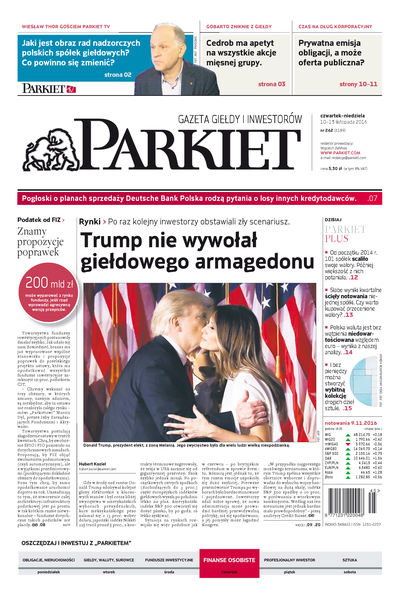 Największy w Polsce newsroom gospodarczy zbiera, analizuje i zgłębia dla Państwa najważniejsze informacje ze świata finansów. Codzienne wydanie „Parkietu”, sześć dni w tygodniu, to kilkadziesiąt artykułów o emitentach, instytucjach finansowych, gospodarce. To również opinie, felietony i wywiady z najważniejszymi ludźmi krajowej i globalnej finansjery.