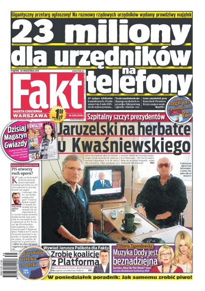 Szpitalny szczyt prezydentów – Jaruzelski na herbatce u Kwaśniewskiego; 23 miliony dla urzędników na telefony – gigantyczny przetarg ogłoszony; Janusz Palikot w wywiadzie dla Faktu – „Zrobię koalicję z Platformą”; „Muzyka Dody jest beznadziejna” – Elżbieta Zapendowska; Jacyków z Polski ucieka do Brazylii by pracować w operze.