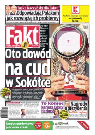 Wczoraj Kościół po raz pierwszy pokazał cudowną hostię z Sokółki; Donald Tusk i Jarosław Kaczyński odpowiadają w Fakcie, jak rozwiążą problemy Polaków; czy kończy się kariera Edyty Herbuś; Bronisław Komorowski rozdał swoim pracownikom ponad 1,7 mln zł; jak zrobić piwo domowym sposobem; Janusz Józefowicz dostał mandat za złe parkowanie.