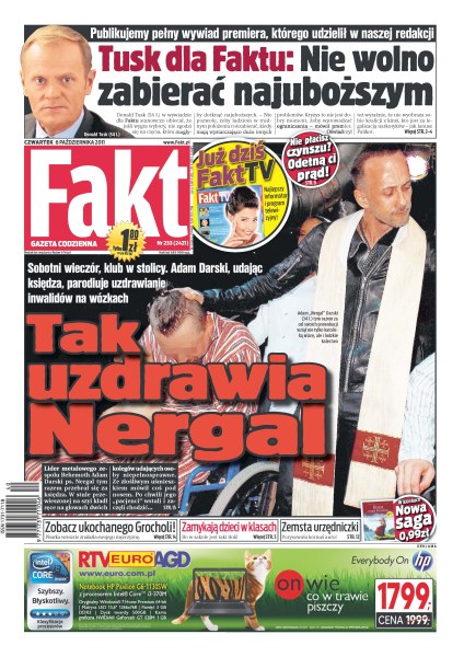 Adam Nergal Darski w przebraniu księdza udawał, że uzdrawia niepełnosprawnych; wywiad z Donaldem Tuskiem; w zatłoczonej szkole w Gdańsku uczniowie muszą spędzać przerwy w klasach; Marta Kaczyńska będzie wspierać Jarosława Kaczyńskiego w kampanii wyborczej, pojawiła się już w spotach kandydatów PiS; Czesław Mozil w pół roku zarobi milion złotych; amerykańscy pedofile uważają się za dyskryminowanych i domagają się swoich praw.