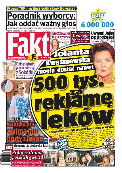 Jolanta Kwaśniewska mogła dostać nawet 500 tys. złotych za reklamę leków; poradnik wyborcy: jak oddać ważny głos; prezes TVP ma dość wybryków Nergala; Robertowi Kubicy za kilka dni wyjmą druty z łokcia; zobacz domy polskich gwiazd; Justyna Steczkowska miała wypadek; ubierz się jak Agata Młynarska; uwaga: od stycznia podrożeją jajka; Kuba Błaszczykowski uratował remis w meczu z Koreą; kibic chce być trenerem Lechii.