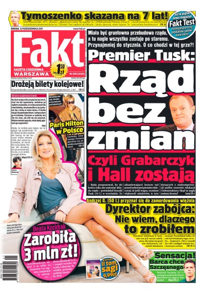 Od poniedziałku droższe są ceny biletów kolejowych Przewozów Regionalnych; Julia Tymoszenko, była premier Ukrainy, została skazana na siedem lat więzienia; mimo zapowiadanych zmian przebudowy rządu, na razie wszystko zostaje po staremu; Andrzej G., dyrektor więzienia w Sztumie, przyznał się do zamordowania więźnia; według Aleksandra Kwaśniewskiego SLD powinno wziąć pod uwagę bliższą współpracę z Ruchem Palikota.