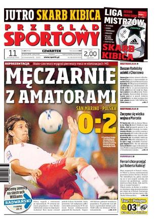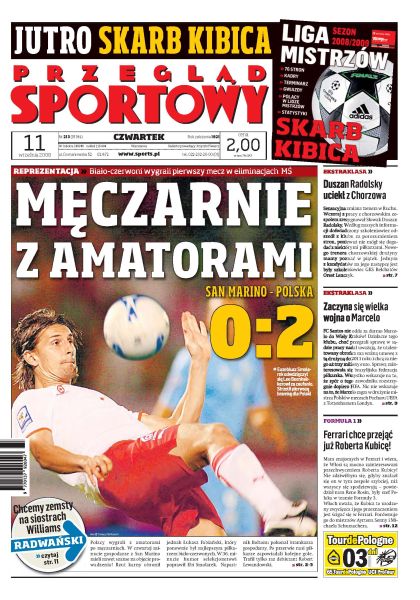 Biało- czerwoni wygrali z San Marino 2:0; Smolarek nie zawiódł oczekiwań selekcjonera; wywiad z Pawłem Brożkiem; Duszan Radolsky zrezygnował z pracy z Ruchem Chorzów; FC Santos żąda od Wisły Kraków 3 mln euro za Marcelo; Ferrari chce przejąć Roberta Kubicę; Radwańska chce rewanżu na siostrach Williams.