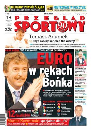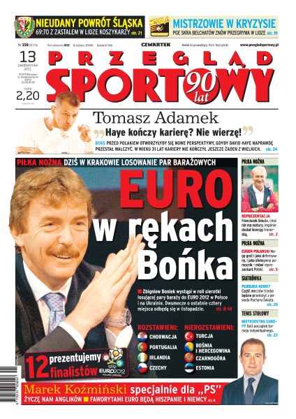 Zbigniew Boniek wystąpi w roli sierotki losującej pary baraży do Euro 2012 w Polsce i na Ukrainie; trener Wisły Kraków Robert Maaskant ma problem ze składem obrony na mecz przeciwko Jagiellonii Białystok; czy bokser David Haye zakończy karierę.