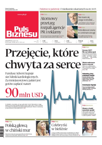 Fundusz Advent kupuje sieć klinik kardiologicznych, za mniejszościowy pakiet jest gotów zapłacić nawet 90 mln USD; PGE rusza z kilkuletnią kampanią mającą zmienić negatywny stosunek Polaków do elektrowni atomowych; Pronox Technology rozpoczął budowę holdingu dóbr luksusowych od przejęcia akcji Esotiq & Henderson; w banku Citi Handlowy będzie można opłacać rachunki przez smartfona; Cezary Grabarczyk, minister infrastruktury, chce obniżyć o połowę autostradowe opłaty dla aut osobowych.