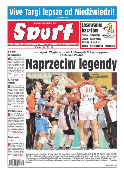 Zostały rozlosowane baraże Euro 2012; miesiąc po porażce z Witalijem Kliczką Tomasz Adamek zaczyna mówić o planach na kolejne walki; Jastrzębski Węgiel wygrał z Sesi Sao Paulo i zagra o złoty medal klubowych mistrzostw świata w siatkówce z Trentino Volley.