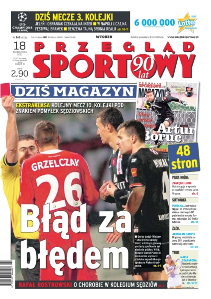 Kolejny mecz 10 kolejki Ekstraklasy pod znakiem pomyłek sędziowskich; Rafał Rostkowski o chorobie w kolegium sędziów; dziś decyzja w sprawie przyszłości trenera Jana Urbana; Jastrzębski Węgiel po srebrnym medalu w klubowych MŚ potwierdza wysoką formę, pokonując 3-0 Trefla Gdańsk; Jarosław Hampel przedstawia nam cały swój team; Maria Szarapowa wyleczyła kontuzję i jako pierwsza uczestniczka Mastersa trenuje już w Stambule.