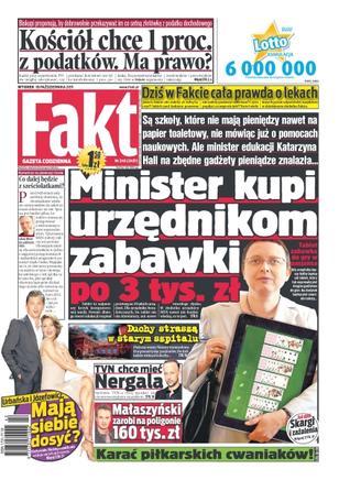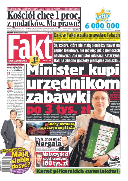 Minister Katarzyna Hall kupi urzędnikom zabawki po 3 tys. zł; TVN chce Nergala; duchy straszą w starym szpitalu; Urbańska i Józefowicz mają siebie dosyć; czy Kościół ma prawo do jednego procenta z naszych podatków; cała prawda o lekach w Fakcie; Małaszyński zarobi 160 tys. zł na poligonie; karać piłkarskich cwaniaków.