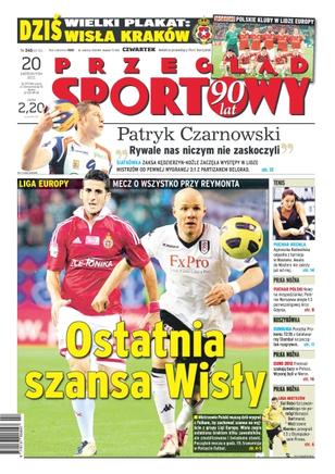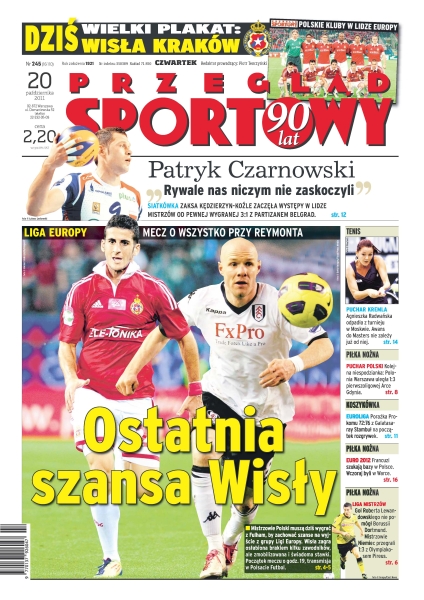 Ostatnia szansa Wisły Kraków – mecz o wszystko przy Reymonta; „Rywale niczym nas nie zaskoczyli” – Patryk Czarnowski o wygranym 3-1 meczu Zaksy Kędzierzyn-Koźle z Partizanem Belgrad; Agnieszka Radwańska odpadła z turnieju w Moskwie – awans do Masters nie zależy już od niej; Polonia Warszawa uległa 1-3 pierwszoligowej Arce Gdynia; porażka Prokomu 72-76 z Galatasaray Stambuł na początek rozgrywek; Francuzi szukają w Polsce bazy na Euro2012 – wczoraj odwiedzili Warkę.