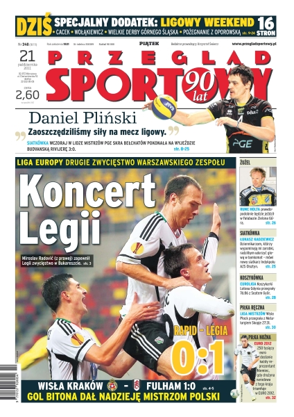 Koncert Legii Warszawa – drugie zwycięstwo warszawskiego zespołu w Lidze Europy; Wisła Kraków pokonała Fulham 1-0; „Zaoszczędziliśmy siły na mecz ligowy” – Daniel Pliński; Rune Holta prawdopodobnie będzie jeździł w Falubazie Zielona Góra; koszykarki Lotosu Gdynia przegrały 78-86 z Seatem Gyoer; Wisła Płock przegrała z Metalurgiem Skopje 27-31; 250 tysięcy euro dostanie każdy reprezentant Niemiec, gdy drużyna narodowa z tego kraju triumfuje w Euro 2012.