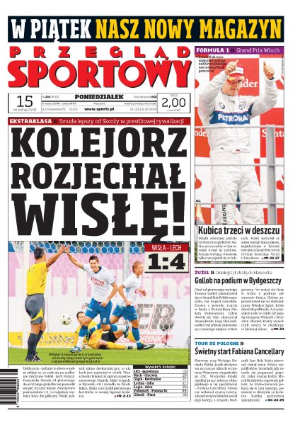 Sensacyjne zwycięstwo Lecha nad Wisłą Kraków; Leo Beenhakker ma pretensje o złośliwy gest w meczu z San Marino; Artur Boruc powraca do światowej formy; w hicie kolejki Premier League Manchester Utd. przegrał z Liverpoolem 1:2; trener Raul Lozano jeszcze w tym tygodniu pożegna się z Polską - kto zostanie nowym trenerem kadry siatkarzy; rozmowa z Tomaszem Gollobem; uczestnicy tegorocznego Tour De Pologne; mimo najgorszych w karierze kwalifikacji Robertowi Kubicy udało się stanąć na podium.