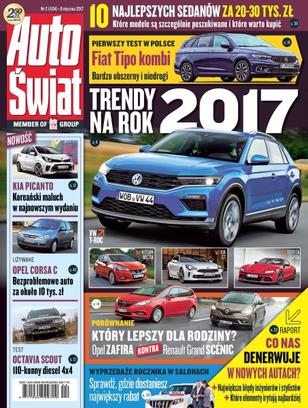 Trendy 2017 – Trend 1: SUV-y dla wszystkich, Trend 2: Maluchy z charakterem, Trend 3: Design bez ograniczeń, Trend 4: Powrót wielkich marek, Trend 5: Moc ponad wszystko; Renault Grand Scénic kontra Opel Zafira – porównanie kompaktowych vanów; Fiat Tipo SW – nowe kombi z benzynowym silnikiem 1.4 turbo; kontrowersyjne rozwiązania w nowych samochodach – co nas denerwuje, a co zachwyca; opony zimowe: wąskie czy szerokie; wyprzedaże aut z roku 2016 – przegląd najciekawszych ofert na rynku.