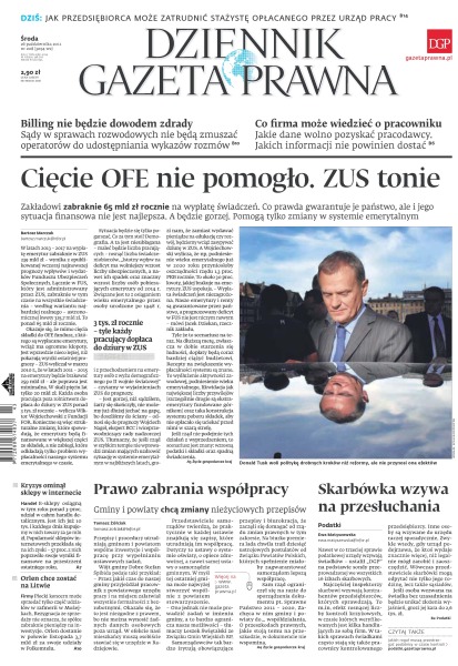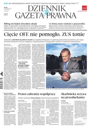 Cięcie OFE nie pomogło – ZUS tonie – zakładowi zabraknie 65 mld zł rocznie; kryzys ominął sklepy w internecie; Orlen chce zostać na Litwie; prawo zabrania współpracy – gminy i powiaty chcą zmiany nieżyciowych przepisów; skarbówka wzywa na przesłuchania; billing nie będzie dowodem zdrady – sądy w sprawach rozwodowych nie będą zmuszać operatorów do udostępniania wykazów rozmów; co firma może wiedzieć o pracowniku – jakie dane wolno pozyskać pracodawcy, a jakich informacji nie powinien dostać; jak przedsiębiorca może zatrudnić stażystę opłacanego przez urząd pracy.