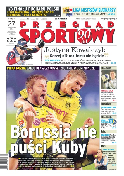 Borussia Dortmund nie puści Kuby Błaszczykowskiego – po małych roszadach Jakub wskoczy na pozycję cofniętego napastnika; „Gorzej niż rok temu nie będzie” – Justyna Kowalczyk o przygotowaniach do sezonu, rywalkach i najważniejszym starcie w Pucharze Świata w Jakuszycach; w 1/8 finału Pucharu Polski Legia Warszawa pokonała Widzew Łódź 3-0, a Limanovia przegrała z Wisłą Kraków 1-2; Wojciech Szczęsny i Łukasz Fabiański dostaną powołania na mecz Polska - Włochy; Śląsk Wrocław pokonał AZS Politechnikę Warszawską 78-63; Agnieszka Radwańska gra dziś z Wierą Zwonariową.