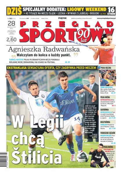 Sensacyjna oferta czy zagrywka przed meczem – Legia Warszawa chce Semira Śtilicia; „Walczyłam do końca o każdy punkt” – Agnieszka Radwańska o dramatycznym meczu z Wierą Zwonariową; Orlen Wisła Płock pokonany przez Vive Targi Kielce 29-34; trudny wybór trenera Anastasiego przed Pucharem Świata w Japonii; porażki Asseco Prokomu i Lotosu Gdynia w Eurolidze; Marcin Dołęga przeszedł operację barku, ale ma być gotów na igrzyska w Londynie; Cristiano Ronaldo jest rozczarowany, że nie udało mu się strzelić setnego gola dla Realu.