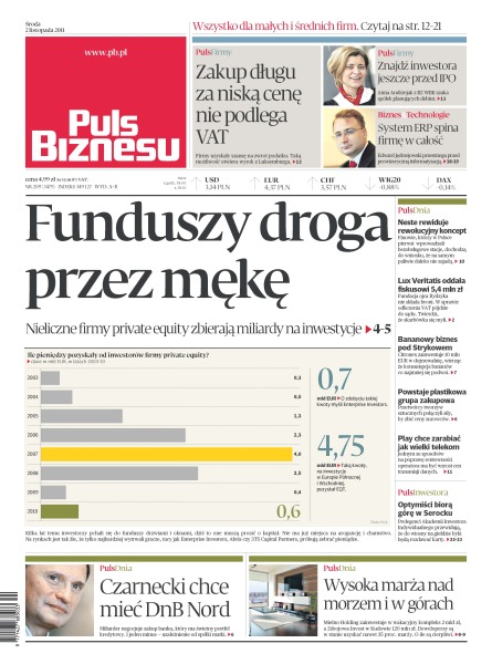 Nieliczne firmy private equity zbierają miliardy na inwestycje; firmy uzyskały szansę na zwrot podatku – taką możliwość otwiera wyrok z Luksemburga; Anna Andrzejak z BZ WBK szuka spółek planujących debiut; Edward Jędrzejowski przestrzega przed prowizoryczną informatyzacją; Neste rewiduje rewolucyjny koncept; Lux Veritatis oddała fiskusowi 5,4 mln zł; Citronex zainwestuje 10 mln EUR w dojrzewalnię, wierząc że konsumpcja bananów co najmniej się podwoi.
