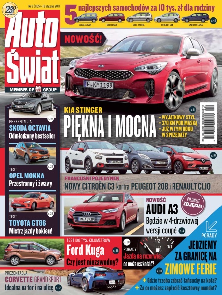 Audi A3 – nowa generacja kompaktu premium za trzy lata; Mercedes GLA – crossover po face liftingu; Kia Stinger – absolutna nowość koreańskiej marki: mocne i szybkie 4-drzwiowe auto sportowe; Skoda Octavia – prezentacja zmodernizowanego bestsellera; Corvette Grand Sport – pierwsza jazda rasowym sportowcem; Citroën C3 kontra Peugeot 208 i Renault Clio – porównanie francuskich maluchów z silnikami 1.2; Opel Mokka X – mały SUV po face liftingu z dieslem i napędem 4x4; Jaguar XJ – brytyjska limuzyna segmentu premium z dieslem.