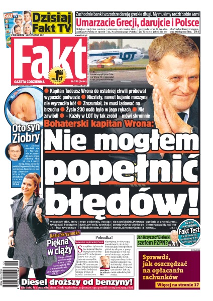 Kapitan Tadeusz Wrona, bohater, dzięki któremu uszkodzony boeing bezpiecznie wylądował na warszawskim lotnisku, wyraża się skromnie o swoim wyczynie; zobacz jak wygląda Jan Ziobro – syn znanego polityka; Kasia Skrzynecka wygląda pięknie w ciąży; nie dość, że auta z silnikiem Diesla są droższe, to jeszcze ropa przebiła cenę benzyny; zachodnie banki szczodrze darują greckie długi, a tymczasem Polska musi radzić sobie sama.